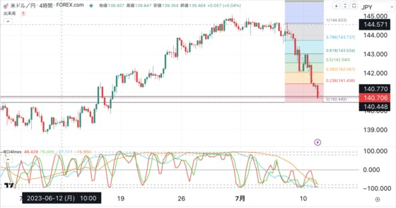 すっかりドル円が捕まってしまいました。日曜配信通り、ドテンショートを狙っていたのですが、昨日の高値は143円まで。あっというまに1日で2.5円も下げてしまいました。140円ミドルはフィボナッチポイント的には買い場になります。非常に難易度が高いのですが、140.30-50でナンピン買いを入れます...