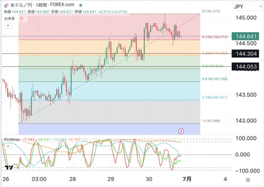 PCE価格指数は予想を下回り、米2年債は4.93→4.86%、10年債3.89→3.83%ドル円は144.35まで下落ピボットのサポ2の144.32維持ドル売りの流れでユーロドル1.0890,ポンドドル1.2690,豪ドル0.6650,ニュージー0.6108まで上昇クロス円も堅調にこの後23時...