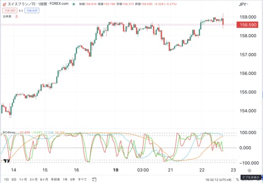 スイス中銀は市場予想通り+0.25%となりました。0.50%を期待していたのですが、その通りにはなりませんでした。これで反落しそうです。スイス円を短期的にドテンショートします。【成行注文】スイス円 158.58成行売り0.50倍 ストップ:159.25 リミット:157.55 【保有ポジション...