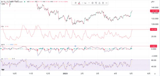 ドル円を打診売り入れていきます。理由としては、4時間足分析ですが、ADXが上昇トレンド、下落トレンド含めてトレンドの勢いが今年最高レベルであること、MACDは今年最高の上昇を演じ、昨年の10月以来ぶりの高水準に。RSIは85超えと直近1年で最もピークにまで上昇しております。またさらにRCI26...
