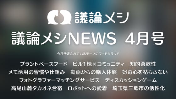 4月はいろいろな節目ですね。せっかくなので、久々に議論メシのイベントに参加してみよう、初めて顔を出してみよう、という方がいたら嬉しいですね!もちろん、定期的に参加してくださる方も引き続き大歓迎です。ライフスタイルに合わせていろいろな参加の仕方があるのが議論メシの特徴のひとつだと思っています。節...