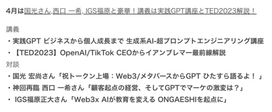 4月は国光さん,西口 一希, IGS福原と豪華!講義は実践GPT講座とTED2023解説!講義・実践GPT ビジネスから個人成長まで 生成系AI-超プロンプトエンジニアリング講座・【TED2023】OpenAI/TikTok CEOからイアンブレマー最前線解説対談・国光 宏尚さん「祝トークン上...