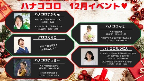 こんにちは!ハナコロなつむです。2022年も最後の月を迎えました!12月のイベントのご案内です!!今年は、あなたにとって、どんな1年でしたか?1年の締めくくりに、ハナココロのイベントをどうぞ!師走のバタバタの中、ほっと一息楽しい時間のイベント♪来年に向けて、今年を振り返るイベント、来年を占うイ...