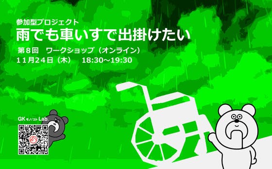 こんにちは!GKモノ/コトLab.です!「雨でも車いすで出掛けたい」第8回オンラインワークショップのお知らせです。11月24日(木)18:30ー19:30です。今回は、11月5-6日の鎌倉リビングラボDayに参加して、サロンメンバーやお客さんとプロトタイプ前に直接会話できましたので、そのフィー...