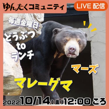 毎週金曜日12時頃から コミュニティ限定の『どうぶつtoランチ』配信中!10月14日(金)のランチは「マレーグマのマーズ」です。マーズをじっくりながめながら、ランチを楽しんでいただけたらと思います!「どうぶつtoランチ」ライブ配信では、コミュニティメンバーのみなさまが「見たい」動物を事前に募り...