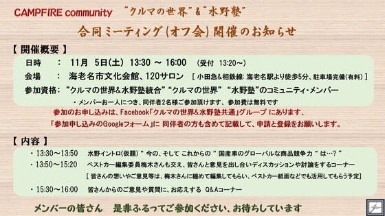 2022年11月5日(土)…CAMPFIREコミュニティ "クルマの世界" と"水野塾" 合同ミーティング(オフ会)実施のお知らせ …… メンバーの皆さんと愉しく交流しましょう。【お申し込み方法】メンバー限定Facebookの 共通グループ で、10月初旬に展開します、"参加申請のGoogle...