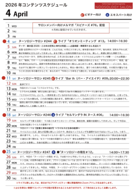⚫︎ヌーソロジーサロン2026年4月度のスケジュールスピナーズの皆さん、こんにちは。コウセンです。原則として毎月1日にお送りしている「今月のスケジュール」ですが、今回は故意に2日にお送りしています(エイプリルフールを避けた?笑)。ということで、正真正銘の4月のヌーソロジーサロンのスケジュールで...