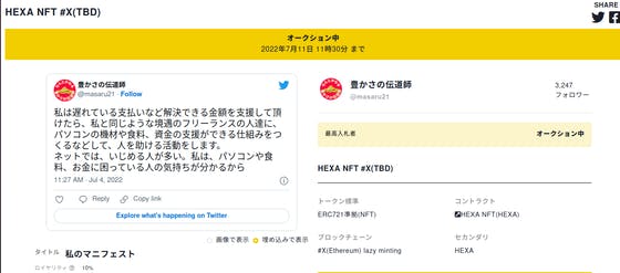 電気代は助けて頂けるけど私が遅れている支払いなど本当に必要な資金を工面できず、夢実現としてバーチャルオフィスの復旧が叶っていないのは、私が世の中の役に立つことが伝わっていないからだと思います。そのため、改めてマニフェストを作りました。そして、NFTとして客観的に分かるようにしました。NFTの販...