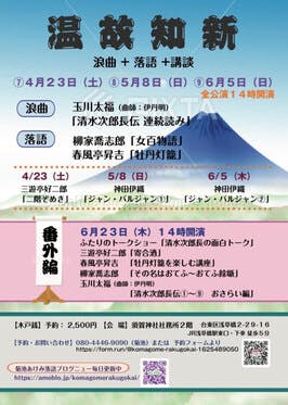 「温故知新」浪曲+落語+講談3ジャンルが織り成すエンターテイメント*落語の部分で昇吉師匠が出演致します!「牡丹燈籠」【日にち】⑦4月23日(日)⑧5月8日(日)⑨6月5日(日)*番外編6月23日(木)【時間】14:00開演【木戸銭】いずれも2500円【会場】須賀神社社務所2階http://ww...