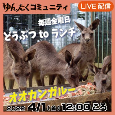 毎週金曜日12時頃から コミュニティ限定の『どうぶつtoランチ』配信中!4月1日(金)のランチは「オオカンガルー」です。オオカンガルーのランチタイムを眺めながら、みなさんもランチを楽しんじゃってください♪「どうぶつtoランチ」ライブ配信では、コミュニティメンバーのみなさまが「見たい」動物を事前...