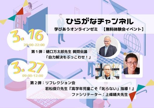 【オンラインゼミ スタートします!】オンラインゼミ 「ひらがなチャンネル」オーナー「上條晴夫」ゼミ長「樋口万太郎」「若松俊介」によるオンライン勉強会です。教育現場におけるICT活用について仲間と交流しながら、リフレクションを通して共に学び成長するためのコミュニティです。「教育DX」について考え...