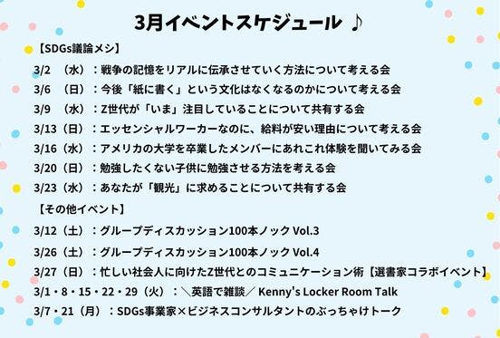 TSUKURU未来研究所主催のディスカッションイベント「SDGs議論メシ」の3月スケジュールを公開しました!全てのイベントの開催時刻は20時と、学生の皆さんが参加しやすいよう設定しましたので、奮ってご応募ください^^!(初回トライアル参加は無料です)トライアル参加を希望される方は、参加したいイ...