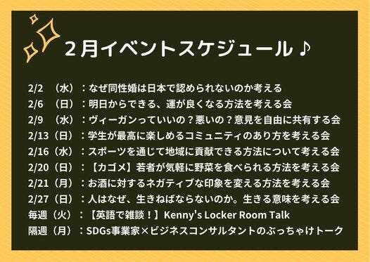 TSUKURU未来研究所主催のディスカッションイベント「SDGs議論メシ」の2月スケジュールを公開しました!全てのイベントの開催時刻は20時と、学生の皆さんが参加しやすいよう設定しましたので、奮ってご応募ください^^!(初回トライアル参加は無料です)トライアル参加を希望される方は、参加したいイ...