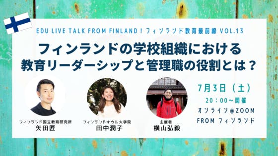 【7/3(土)20:00〜】フィンランドの学校組織における教育リーダーシップ と管理職の役割とは? ゲスト:フィンランド国立教育研究所・矢田匠さん(フィンランドからLIVE配信)