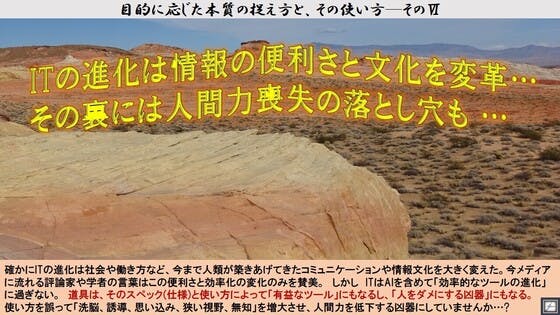 目的に応じた本質の捉え方と、その使い方フリートーク講座・・・今回は、“ITの進化は情報の便利さと文化を変革…その裏には人間力喪失の落とし穴も…”です。確かに、ITの進化は社会の働き方やコミュニケーションそして情報文化を大きく変えました。それは「どこでも繫がり使える便利さ、手に入る情報の多様化、...