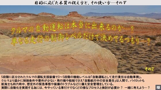 目的に応じた本質の捉え方と、その使い方フリートーク講座。今回は “クルマの自動運転は本当にできるのか…? 単なる走行制御のレベルだけで決めているつもり…?” 〖その2(後編)〗です。既に国土交通省からは「自動運転の定義及び政府目標」や「自動運行装置の保安基準等の概要」が出され、更にメディアでは...