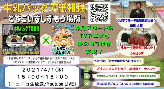 牛乳パックで紙相撲と4月スタートのTVアニメ「どすこいすしずもう」のスペシャルコラボ配信の録画が観れます! どすこいすしずもう公式サイト⇒ https://sushisumo.jp/今回のコラボ配信はどすこいすしずもう製作委員会様のご協力のもと開催しました。
