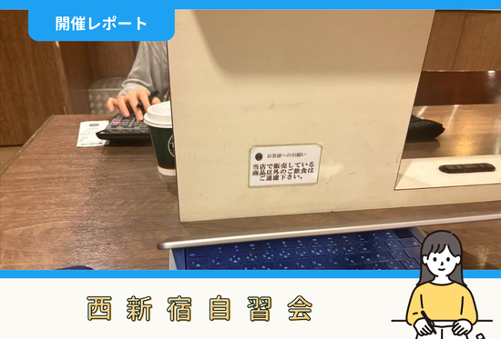 こんにちは!ファシリテーターの小西です(^▽^)/3月8日(日)に開催した西新宿自習会の報告をします。目次1.タイムスケジュール2.勉強・作業内容3.感想参加申込みはこちら!1.タイムスケジュール今回は下記のタイムスケジュールで開催しました。08:30 開催場所に集合08:40 簡単に自己紹介...
