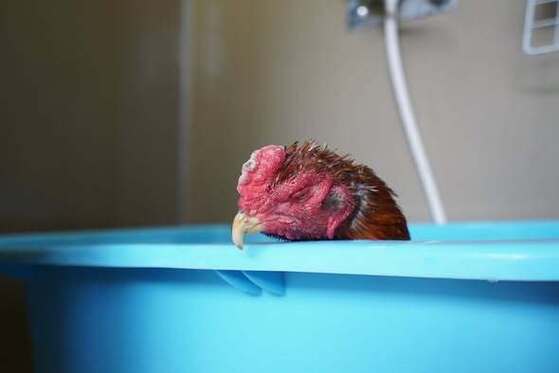 写真は、石垣島の後上里議員宅の闘鶏場から、闘鶏が行われていた1月初めに通報し、その時に闘わされていた「受け側」の軍鶏です。警察に押収され、そのまま八重山保健所で保管されていました。しかし、飼育方法も十分にわからないまま、適切な治療も施されず、2ヶ月以上も保管。やっと釈放されました。全身はトリサ...