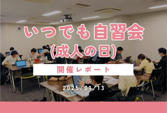 こんにちは!コミュニティマネージャーの古岩井です(^▽^)/1/13(月)に開催したいつでも自習会@九段下の開催報告を致します。目次1.いつでも自習会って何?2.タイムスケジュール 3.勉強・作業内容4.感想 1.いつでも自習会って何?いつでも自習会とはレンタルスペース等を貸し切って、1日かけ...
