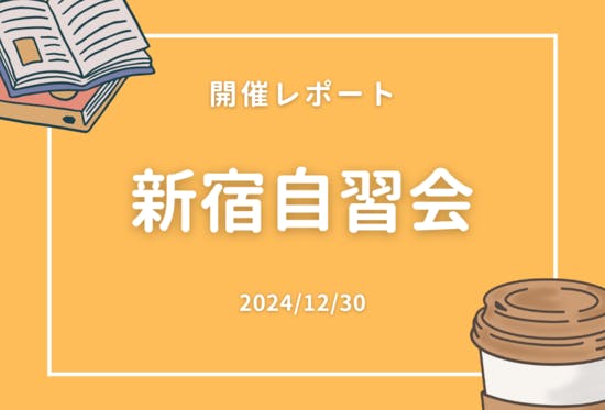 こんにちは!ファシリテーターのおくいです!今回は、12/30(月)に開催した新宿自習会の開催報告をさせていただきます。目次1.タイムスケジュール2.勉強・作業内容3.感想1.タイムスケジュール今回は下記のタイムスケジュールで開催しました。09:00 カフェに集合09:10 簡単な自己紹介等09...