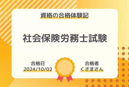 こんにちは。コミュニティメンバーのくさまと申します。2024年8月25日に受験した社会保険労務士試験に合格したのでご報告させていただきます。特別な勉強法は何も行っていないのですが、少しでもご参考になれば幸いです。目次1.学習・受験状況2.受験理由3.試験の感想4.合格に向けて意識したこと5.勉...