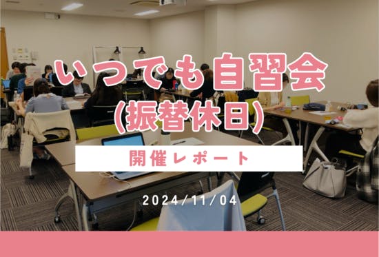 こんにちは!コミュニティマネージャーの古岩井です(^▽^)/11/4(月)に開催したいつでも自習会@九段下の開催報告を致します。目次 1.いつでも自習会って何?2.タイムスケジュール 3.勉強・作業内容4.感想 1.いつでも自習会って何?いつでも自習会とはレンタルスペース等を貸し切って、1日か...