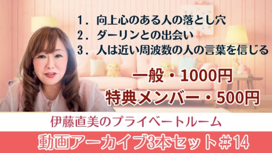 伊藤直美さんの撮りおろし動画3本セット#14伊藤直美のプライベートルームにて過去に公開された動画です。【コンテンツ 】直美さん撮りおろしの動画3本セットです。ゆるッとした動画も含み、成長心や周波数についてのお話です。1.今の自分を受け入れて。向上心のある人の落とし穴成長心に潜む落とし穴について...