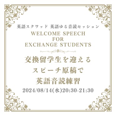 こんにちは!英語スクワッドのユリです。本日8/14(水)20:30~21:30の「英語ゆる音読セッション」は、オリジナルのスピーチ原稿をゆるく音読しながら英語のリズムを練習します。「姉妹都市として定期的に学生たちを迎えている自治体の議員さんや、交換留学制度を主催する地元の国際交流団体の代表さん...
