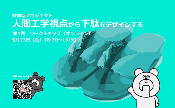 こんにちは! GKモノ/コトLabです!「人間工学視点から下駄をデザインする」第1回オンラインワークショップのお知らせです。9月13日(木)18:30ー19:30です。人間工学視点から下駄をデザインしちゃおうっていうプロジェクト。誰かに頼まれたわけではありません笑。いいものが出来たらその先の商...