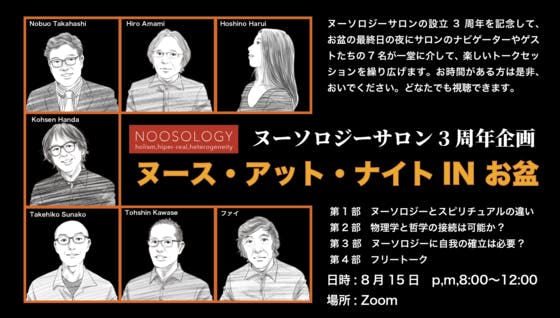 ●【ヌーソロジーサロン設立3周年記念企画】「ヌース・アット・ナイトINお盆」開催アドレスのお知らせスピナーズの皆さん、お盆休み、いかがお過ごしですか?前々からお伝えしていたように、明日15日午後8:00より、ヌーソロジーサロン設立3周年を祝して、「ヌース・アット・ナイトINお盆」をzoomにて...