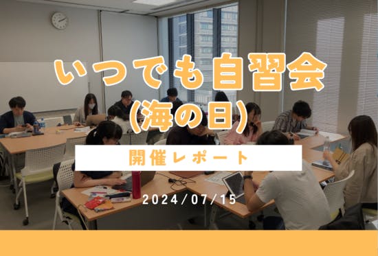 こんにちは!コミュニティマネージャーの古岩井です(^▽^)/7/15(月)に開催したいつでも自習会@九段下の開催報告を致します。目次1.いつでも自習会って何?2.タイムスケジュール3.勉強・作業内容4.感想1.いつでも自習会って何?いつでも自習会とはレンタルスペース等を貸し切って、1日かけて行...