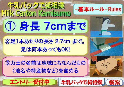 おかげさまで牛乳パックで紙相撲は15周年!日本の伝統文化である「紙相撲」ですが、私たちは当初からより多くの方が楽しめる新しいスタイルの紙相撲を目指しています。そこで、新しい時代の紙相撲へ向けてさらなる進化をと、ルールを緩和することにしました!【力士の身長を7cmまでに】暫定的に従来の6.5cm...