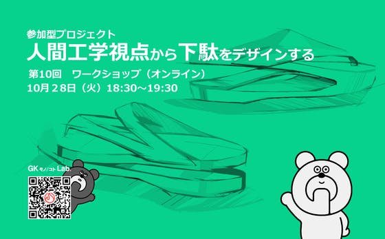 こんにちは!GKモノ/コトLab.です!「人間工学視点から下駄をデザインする」第10回オンラインワークショップのお知らせです。10月28日(火)18:30ー19:30です。ひょんなことから関係ができた下駄メーカーへ向けて、勝手に下駄を提案しちゃおうっていうプロジェクト。その第10回目オンライン...