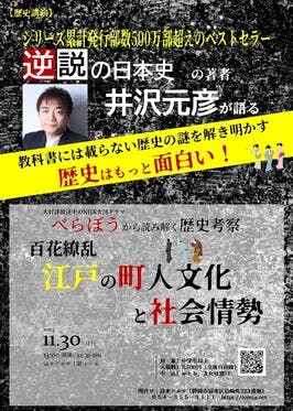歴史家 井沢元彦の話を生で聞こう!令和7年11月30日(日) 13:00 開演 2時間程度 場所 静岡市清水区島崎町223番地 静岡市東部勤労者福祉センター 1階ホール江戸時代 町人文化が花開いた頃を描いた 大河ドラマ べらぼう文化を発展させることで経済の発展を促そうとした時代から文化を制限...
