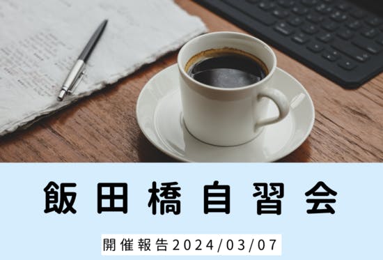 こんにちは! ファシリテーターのイシダです(^^) 今回は3/7(木)に開催した飯田橋自習会の開催報告をしたいと思います!目次1.タイムスケジュール2.勉強・作業内容3.感想1.タイムスケジュール今回は下記のスケジュールで開催しました。~08:30 お店に集合/座席の確保/飲み物を買う08:3...