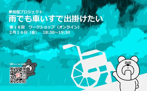 こんにちは! GKモノ/コトLabです!「雨でも車いすで出掛けたい」第18回オンラインワークショップのお知らせです。2月16日(金)18:30ー19:30です。現在、製品移行に向けてプロトタイプの最終調整を検討しています。そのあたりの情報共有をしていきます。*オンラインワークショップ会議ルーム...