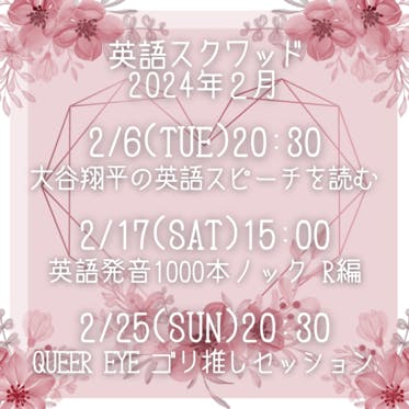 2月が始まりました!今月の英語スクワッド オンラインイベントのご案内です推しについて語りつくす1ヶ月今月は(も)英語にまつわるあれこれの中から、私の推しやこだわりの止まらないトピックについてお話します!2/6(火)20:30〜 英語ゆる音読セッション「大谷翔平さんの英語スピーチ音読」https...