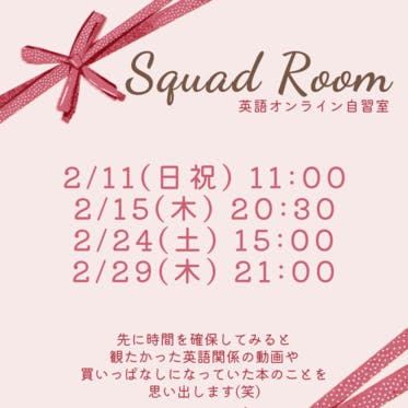 週に1回の英語オンライン自習室「Squad Room」今月も開いております^^英語オンライン自習室 Squad Room(スクワッドルーム)開催日程2/11(日祝) 11:00〜12:002/15(木) 20:30〜21:302/24(土) 15:00〜16:002/29(木) 21:00〜2...