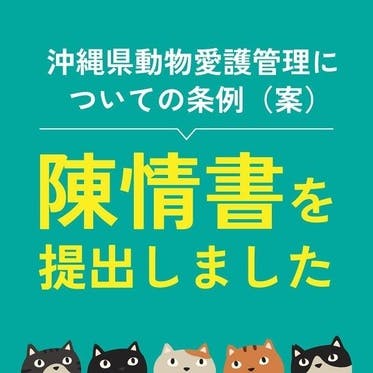 「沖縄県動物の愛護及び管理に関する条例(案)」へ意見を提出しました。また、県内の愛護グループと連名で陳情書を提出しました。愛護グループの主な意見は13条の猫の餌やり禁止条項ですが、私たち北部やんばるの住民にとっては10条2項の削除が切実です。以下、にゃごねっとからの意見です。10条2項 (愛護...