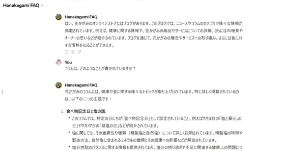 この度担当していますお店のチャットボットを、ChatGPTのGPTsという機能を使って作りました。ChatGPT Plusを使っている人しか利用できないですが、ぜひ、試してみてください。配食の花かがみのオンラインストアで掲載されているコラムも学習していますので、配食の花かがみのオーナーの事業に...