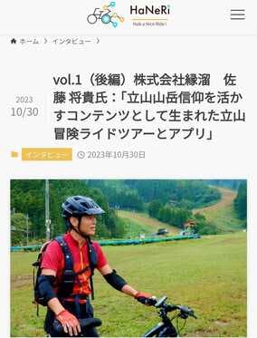 2023年10月にリリースした、ツアーガイドアプリ「立山冒険ライド」を製作頂いたイー・フォースさんが、なんと!自転車活用の新たなスタイルを発信するオウンドメディア「HaNeRi」で、アプリができるまでのバックストーリーをインタビュー記事として掲載頂きました!ぜひぜひ観てみてください!!!前編h...