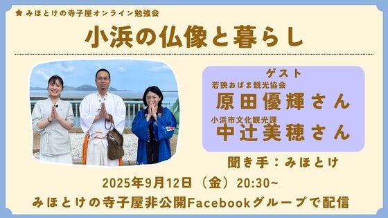 みほとけの寺子屋オンライン勉強会では様々なゲストをお迎えして仏像やお寺にまつわる世界を深掘りするお話をしていきます。今回は小浜市の悠久の歴史と神仏との関わりを、楽しく語り合います。テーマ「小浜の仏像と暮らし」ゲスト講師:若狭おばま観光協会 原田優輝さん小浜市文化観光課 中辻美穂さん(...