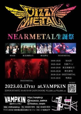 3月17日(金) 浅草VAMPKINNEARMETAL生誕祭■OPEN=18:40■START=19:00※東京演劇女子. 出演時間帯=19:40~20:00■前売=¥2,500■当日=¥3,000※各+1D山本尚未が以前、在籍していたDIZZYMETALさん主催のライブ!!NEARMETAL...