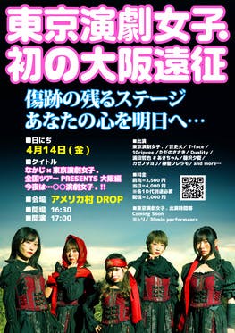 東京演劇女子. が 初めて大阪に乗り込み、熱きパフォーマンスをお届けします!!!4月14日(金) アメリカ村 DROPなかじ×東京演劇女子.全国ツアーpresents 大阪編今夜は…○○演劇女子. !!●開場=16:30●開演=17:00※東京演劇女子. =トリ/30分パフォーマンス●前売=3...
