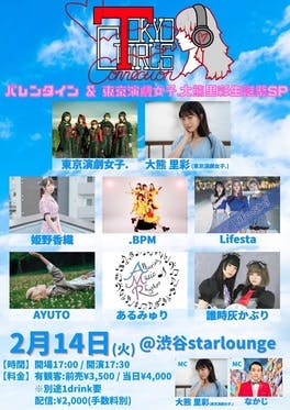 2月12日(日)『東西聖戦 IDOL COLOSSEUN 東京一回戦』後の東京演劇女子.2月の【動員重要】ライブのお知らせ①2月14日(火) 渋谷star loungeTOKYO GIRLS CONNECTION〜バレンタイン&東京演劇女子. 大熊里彩誕生日当日SP〜開場=17:00 ...