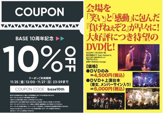 11月25日(金) 12:00~本日11月月27日(土) 23:59 までBASEより、COUPONが出されており、10% OFFでご購入いただけます。東京演劇女子. ONLINESHOP『負げねぇぞぇ2』のDVDは勿論、他の東女. グッズ…在庫激少の…■マフラータオル■バックプリントTシャツ...