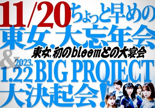 11月20日(日)の夜 に開催の東京演劇女子. 初の!「bloomの皆様と呑んで気さくに交流を」という『大宴会の場』!『ちょっと早めの東女. 大忘年会&2023.1.22 BIG PROJECT 大決起会』15名様限定13名様ご予約賜り、お枠の方、あと2名様となりました。2度とないかも知れない...