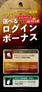 3月のギルドメンバーログインボーナスギルドメンバーの皆様、いつもありがとうございます。3月に入り既に一週間が経ってしまいましたが、3月のギルドメンバーログインボーナスをお知らせいたします。ギルドカードをスタッフに提示することで【シャーベット一品】または【+300円までのラム酒1杯】のどちらかを...