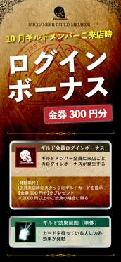 【10月のギルドメンバーログインボーナス】2021年10月のログインボーナス◆バッカニア紙幣300円◆※ご来店時スタッフにギルドメンバーカードをご提示ください。※お会計2000円以上に限ります。今回お配りしている「バッカニア紙幣」ですが、通常だとお会計時に金券として使えるのですが「別の使い道」...